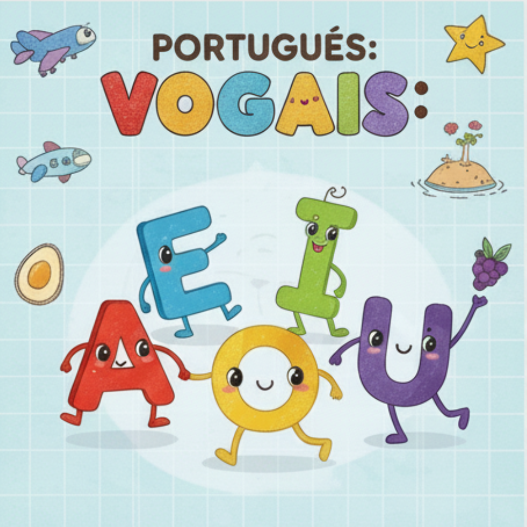 Este material foi desenvolvido como a porta de entrada para o mundo da leitura. Com um design lúdico e personagens cativantes para cada letra (A, E, I, O, U), o conteúdo foca na consciência fonológica e no reconhecimento visual.